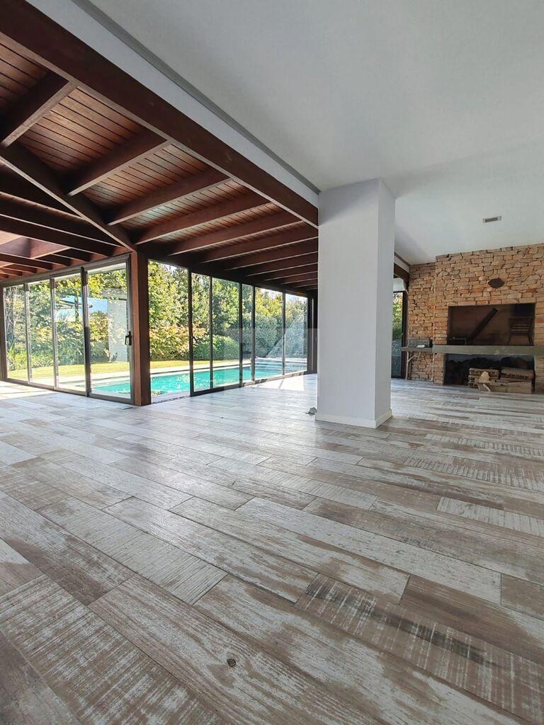 Gran galería/barbacoa cubierta y con vidrios corredizos con vista soñada a área de jardín y piscina.