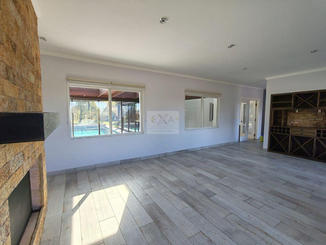 Gran living-comedor con detalles de categoría, mueble botellero y estufa a leña.